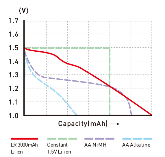 • Curba de descărcare de nouă generație: tensiune scăzută treptat, performanță stabilă pentru dispozitive cu consum redus, durată mai lungă decât NiMH sau alcaline.