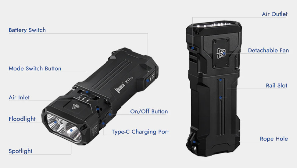 • Fascicul Comutabil între Flood și Throw – Echipată cu LED CREE XHP50.3 HI. Comutați ușor între lumină difuză largă și fascicul la distanță lungă pentru diferite scenarii. O lanternă reîncărcabilă versatilă pentru toate utilizările.